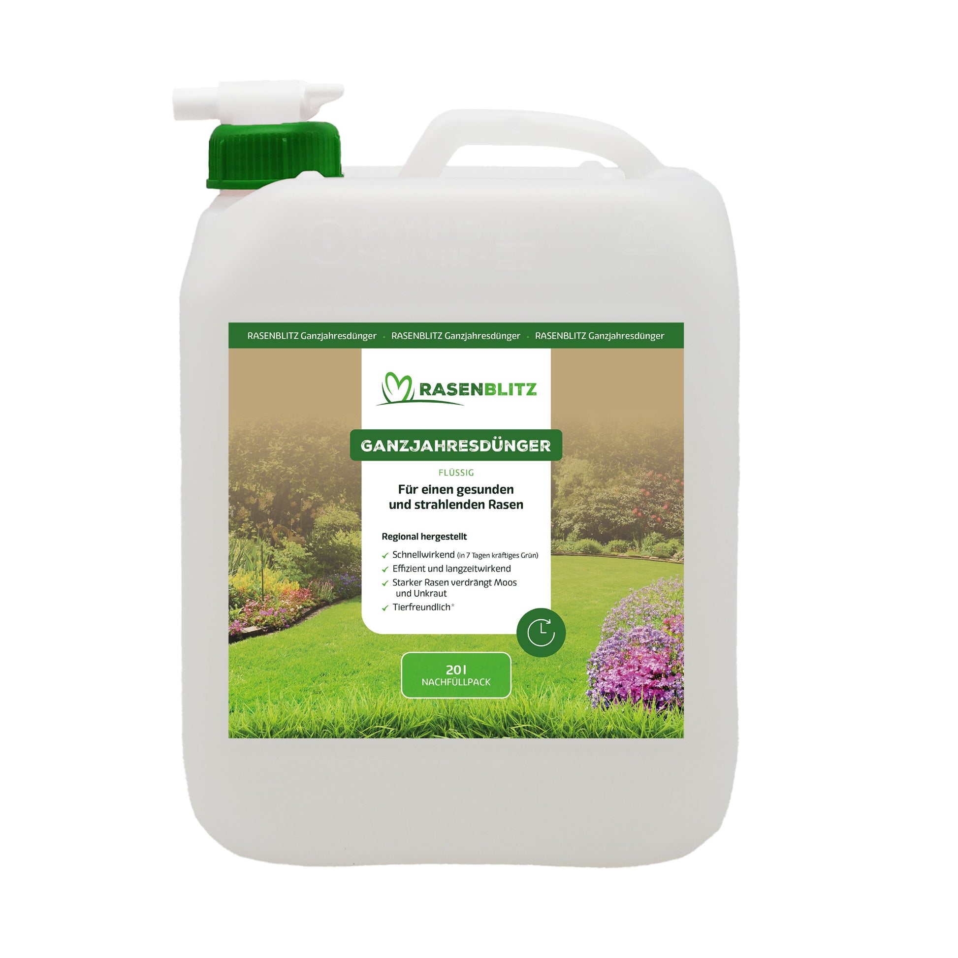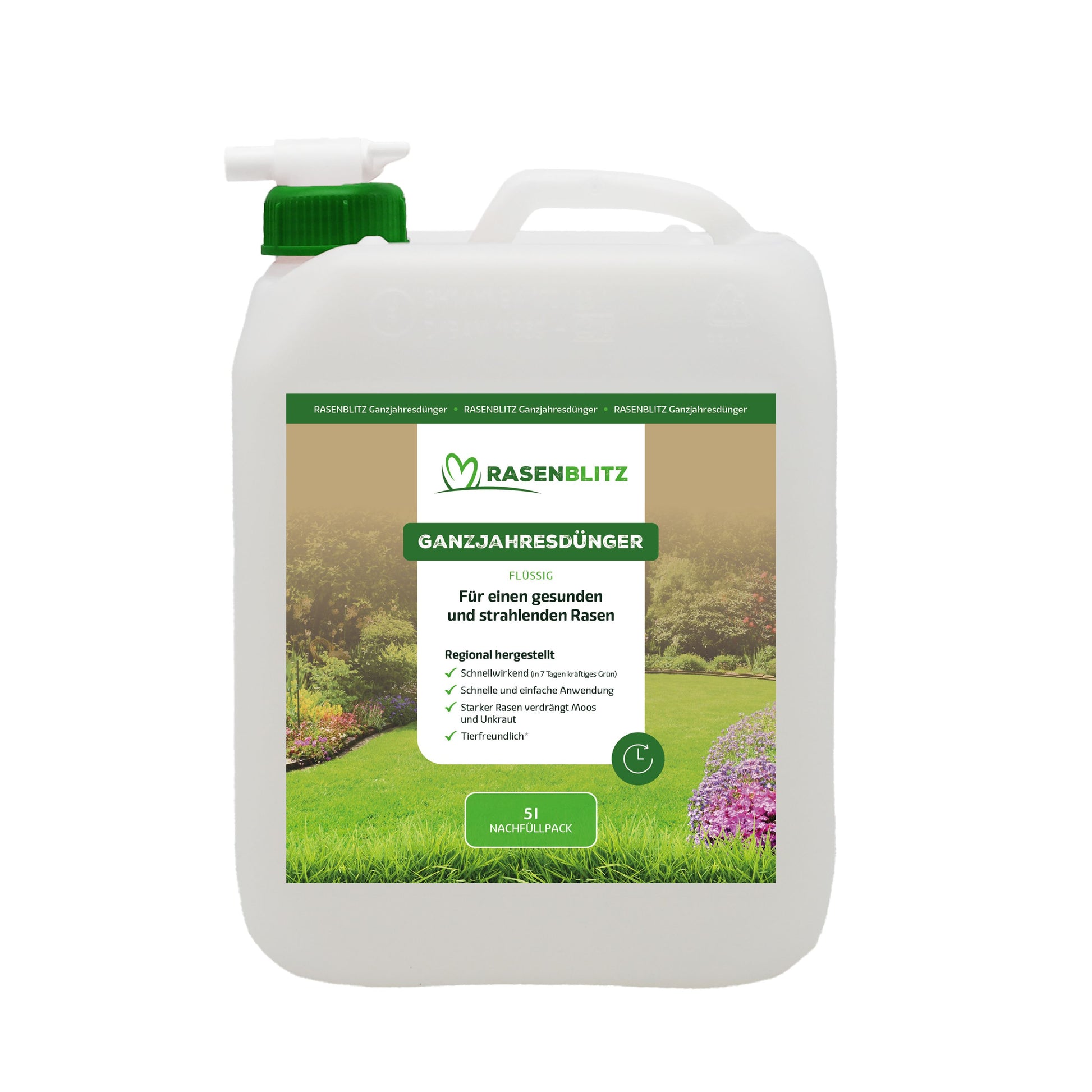 Eine 5-Liter-Kanister von unserem RASENBLITZ NACHFÜLLPACK reicht für eine Rasenfläche von circa 500 Quadratmetern.