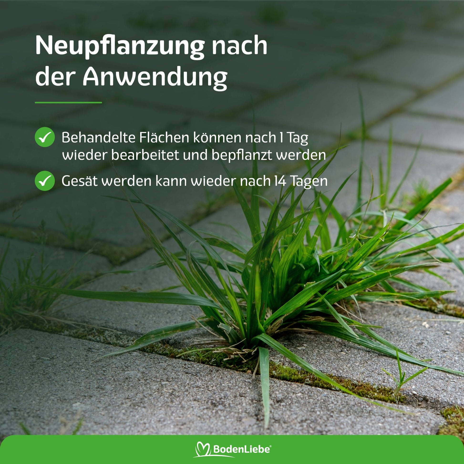 Damit das Mittel seine Wirkung vollständig entfalten kann, sollten behandelte Flächen einen Tag lang nicht bearbeitet werden. Der Boden kann danach wieder bearbeitet und bepflanzt werden. Gesät werden kann wieder nach 14 Tagen.